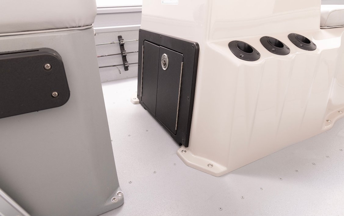 Add the optional lockable console door to your boat for added security for your valuables. Angler has room for 6 rods in the upright rod holders on the console. |