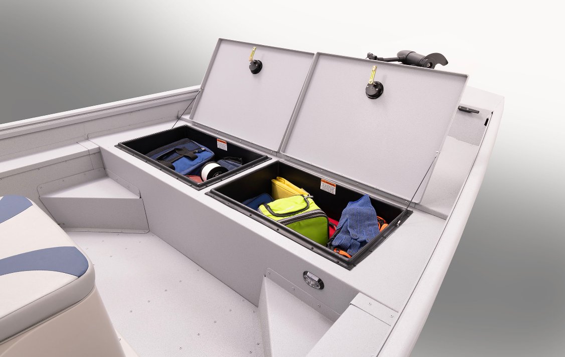 Lockable storage and the step to front deck provides easy movement in the boat. Shown with optional MinnKota® trolling motor. |